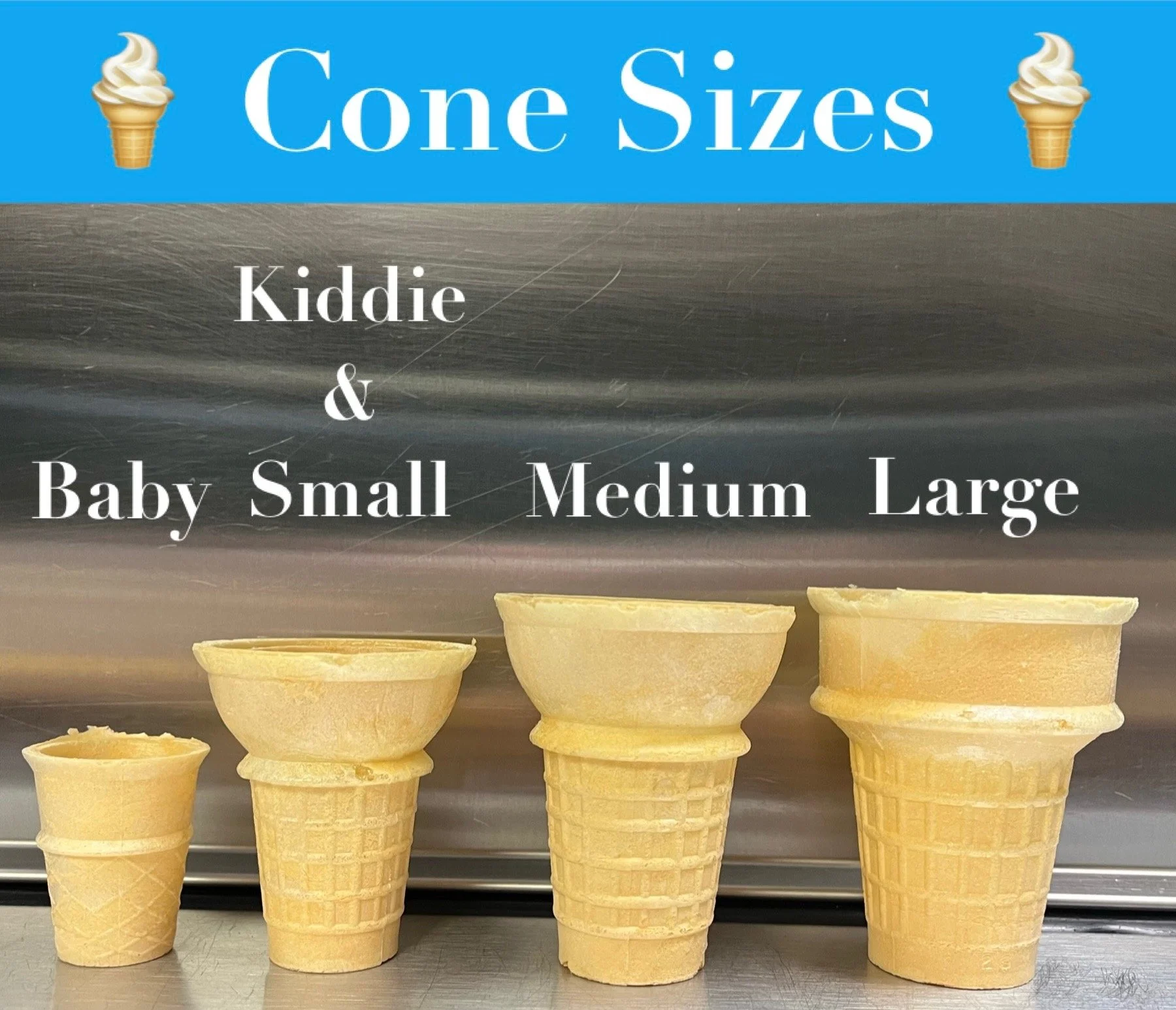 Kiddie: $2.00 Small: $2.50 Medium: $3.00 Large: $3.50